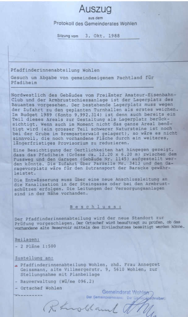 Damals musste sich die Pfadfinderinnen-Abteilung Wohlen (vor der Fusion waren es noch zwei getrennte Abteilungen) ein neues Zuhause suchen. Das Pfadisliheim beim Ortsausgang Richtung Bremgarten musste den Expansionsplänen der Firma Ulrich Matter AG weichen. Die Gemeinde Wohlen bot bei der Bleichi einen neuen Standort an. Doch wie zügelt man eine ganze Holzbaracke? Da kam ein Hochbauzeichner im letzten Jahr seiner Lehre wie gerufen. Chlötzli bot sich an, die Pläne zu zeichnen, die Kosten zusammenzutragen, die Baubewilligung einzuholen und Handwerker und Freiwillige aufzubieten. Das Budget betrug 20’000 Franken. Mit diesen beschränkten Mitteln das Vorhaben zu realisieren, war nur möglich, wenn viele Freiwillige Fronarbeit leisten und Handwerker, wie unter anderen die Zimmerei Wey, Villmergen, auf einen grossen Teil ihrer Forderungen verzichten würden. So griffen etwa die Mitglieder des Vereins Circolo A.C.L.I. am Feierabend den aufgebotenen Pfadis beim Giessen des Fundaments unter die Arme. Der Zivilschutz stellte eigene Leute und ein Mowag-Fahrzeug zur Verfügung. Mit geeinten Kräften glückte der Umzug. Am Ende von Chlötzlis Rekrutenschule stand das Pfadisli- und Bienliheim in neuem Glanz am neuen Standort bei der Bleichi.