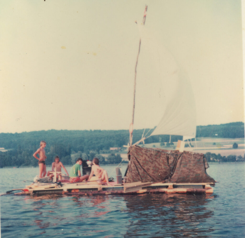 Wieso nicht eine Woche mit einem selbstgebastelten Floss auf dem Hallwilersee verbringen? Frosch verfasste im Juni 1976 kurzerhand ein Gesuch an das zuständige Strassenverkehrsamt Aargau und liess dieses von den volljährigen (weil wenige Jahre älteren) Aufsichtspersonen Mowgli und Jogi unterschreiben. Und tatsächlich: wenige Wochen später und gerade noch rechtzeitig flatterte die Verfügung (mit Auflagen) ins Haus. Innerhalb weniger Tage wurde auch schon das Material gefunden: dürre Tannen als Rahmen, 10 grosse Fässer für den Auftrieb, ein gefällter Baum als Mast, ein grosses Tuch als Segel und Winkeleisen. Während einer Woche übernachtete die Roverrotte Pedalosine im Blachenzelt auf einem Floss und segelte tagsüber zwischen Booten und Schiffen auf dem Hallwilersee.